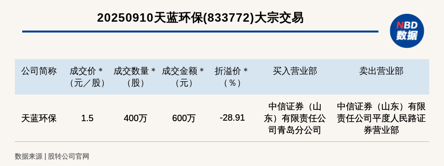 每經(jīng)訊,2025年9月10日,新三板基礎(chǔ)層公司天藍(lán)環(huán)保(833772,收盤價:2.11元)發(fā)生一筆大宗交易,成交價1.5元/股,成交數(shù)量400萬股,成交金額600萬元,折價28.91%。買入營業(yè)部是中信證券(山東)有限責(zé)任公司青島分公司,賣出營業(yè)部是中信證券(山東)有限責(zé)任公司平度人民路證券營業(yè)部。