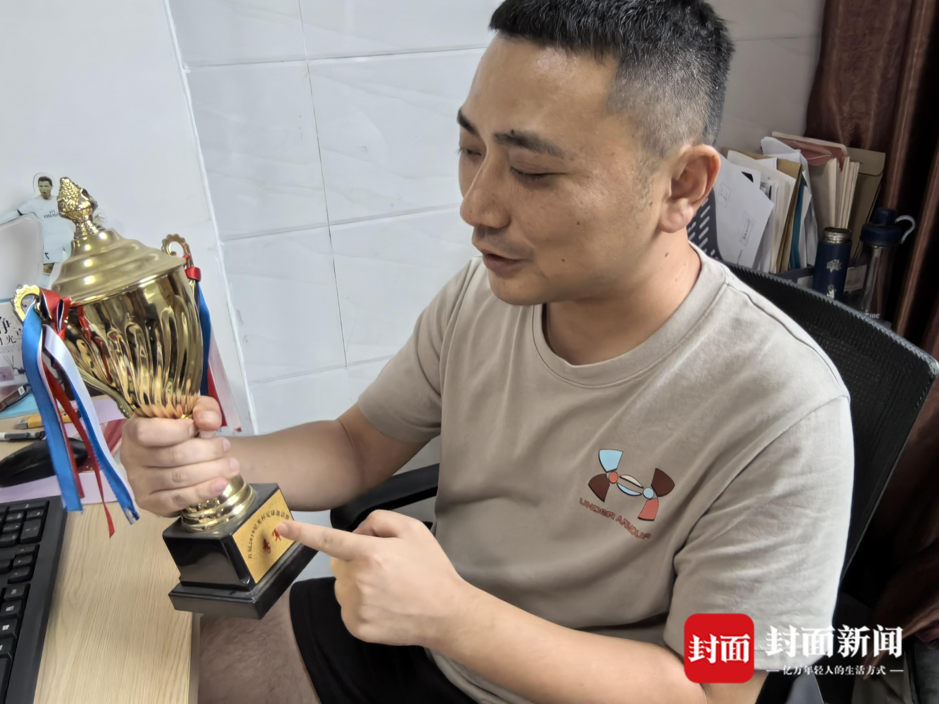 陳龍展示自己的球隊在參加達州周末足球聯賽獲得的獎杯