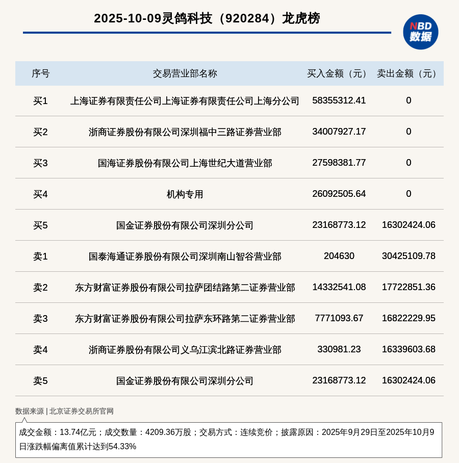 每經(jīng)訊,2025年10月9日,北交所上市公司靈鴿科技(920284,收盤價(jià):39.41元)登上龍虎榜,交易方式是連續(xù)競(jìng)價(jià),披露原因是2025年9月29日至2025年10月9日漲跌幅偏離值累計(jì)達(dá)到54.33%,成交數(shù)量4209.36萬(wàn)股,成交金額13.74億元。買一席位為上海證券有限責(zé)任公司上海證券有限責(zé)任公司上海分公司,買入5835.53萬(wàn)元;賣一席位為國(guó)泰海通證券股份有限公司深圳南山智谷營(yíng)業(yè)部,賣出3042.51萬(wàn)元。