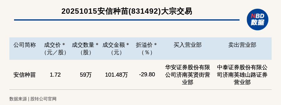 每經(jīng)訊,2025年10月15日,新三板創(chuàng)新層公司安信種苗(831492,收盤價:2.45元)發(fā)生一筆大宗交易,成交價1.72元/股,成交數(shù)量59萬股,成交金額101.48萬元,折價29.8%。買入營業(yè)部是華安證券股份有限公司濟南英賢街營業(yè)部,賣出營業(yè)部是中泰證券股份有限公司濟南英雄山路證券營業(yè)部。