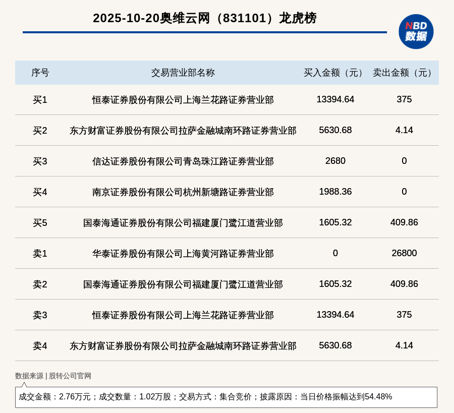 每經(jīng)訊,2025年10月20日,新三板基礎(chǔ)層公司奧維云網(wǎng)(831101,收盤(pán)價(jià):2.68元)登上龍虎榜,交易方式是集合競(jìng)價(jià),披露原因是當(dāng)日價(jià)格振幅達(dá)到54.48%,成交數(shù)量1.02萬(wàn)股,成交金額2.76萬(wàn)元。買(mǎi)一席位為恒泰證券股份有限公司上海蘭花路證券營(yíng)業(yè)部,買(mǎi)入1.34萬(wàn)元;賣(mài)一席位為華泰證券股份有限公司上海黃河路證券營(yíng)業(yè)部,賣(mài)出2.68萬(wàn)元。