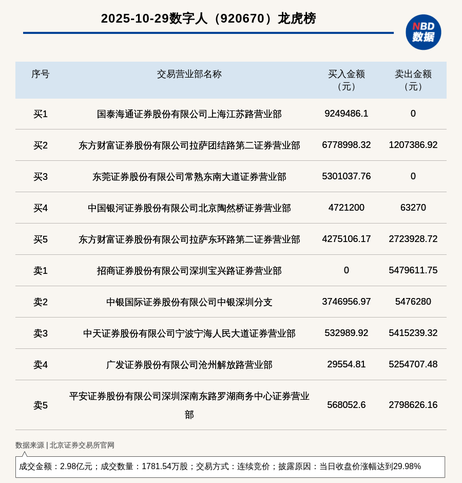 每經(jīng)訊,2025年10月29日,北交所上市公司數(shù)字人(920670,收盤價(jià):18.47元)登上龍虎榜,交易方式是連續(xù)競(jìng)價(jià),披露原因是當(dāng)日收盤價(jià)漲幅達(dá)到29.98%,成交數(shù)量1781.54萬股,成交金額2.98億元。買一席位為國泰海通證券股份有限公司上海江蘇路營業(yè)部,買入924.95萬元;賣一席位為招商證券股份有限公司深圳寶興路證券營業(yè)部,賣出547.96萬元。