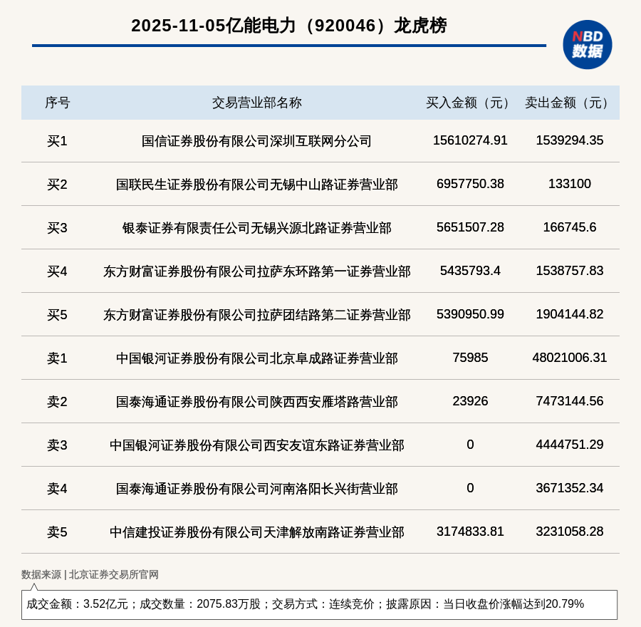 每經(jīng)訊,2025年11月5日,北交所上市公司億能電力(920046,收盤價:17.95元)登上龍虎榜,交易方式是連續(xù)競價,披露原因是當(dāng)日收盤價漲幅達到20.79%,成交數(shù)量2075.83萬股,成交金額3.52億元。買一席位為國信證券股份有限公司深圳互聯(lián)網(wǎng)分公司,買入1561.03萬元;賣一席位為中國銀河證券股份有限公司北京阜成路證券營業(yè)部,賣出4802.1萬元。