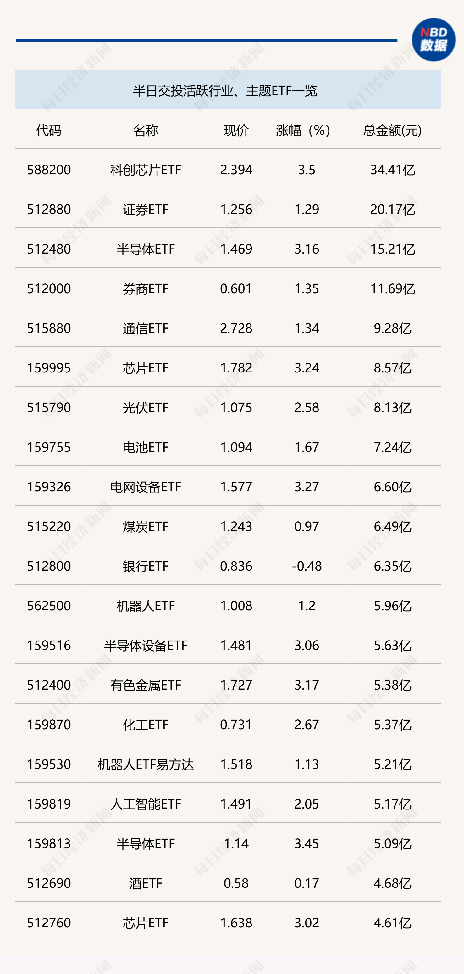 ETF漲幅榜上,半導(dǎo)體產(chǎn)業(yè)ETF(159582)和半導(dǎo)體設(shè)備ETF(561980)半日漲幅近4%,領(lǐng)漲整個(gè)ETF市場,光伏ETF、有色ETF以及電網(wǎng)設(shè)備ETF同樣表現(xiàn)搶眼,多只相關(guān)ETF半日漲幅超3%。