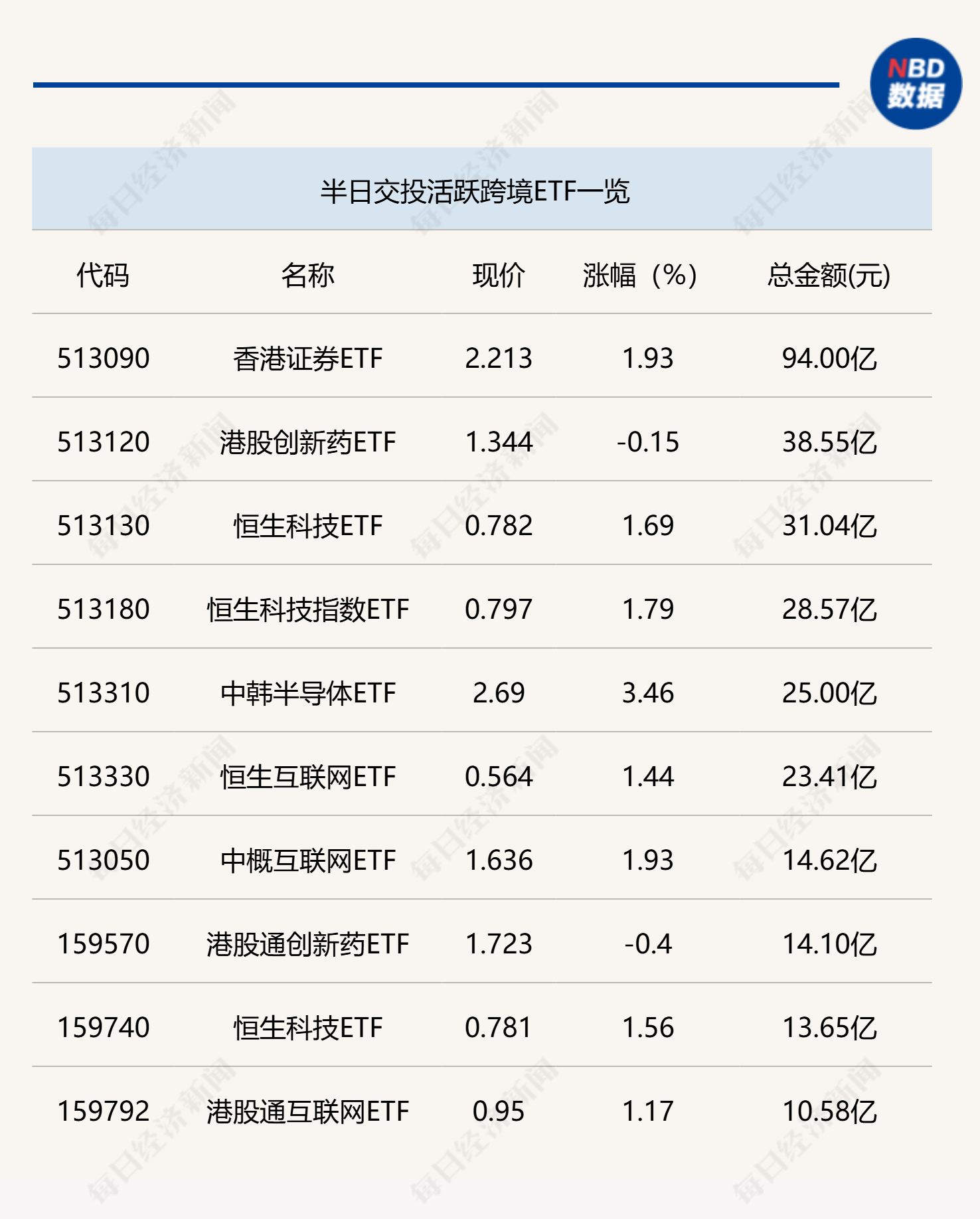 今日上午,隨著半導(dǎo)體板塊集體走強(qiáng),半導(dǎo)體相關(guān)ETF交投活躍,其中,科創(chuàng)芯片ETF(588200)半日成交金額達(dá)到34.41億元,半導(dǎo)體ETF(512480)成交金額達(dá)15.21億元。在跨境ETF方面,香港證券ETF(513090)再度放量,半日成交金額達(dá)到94億元。