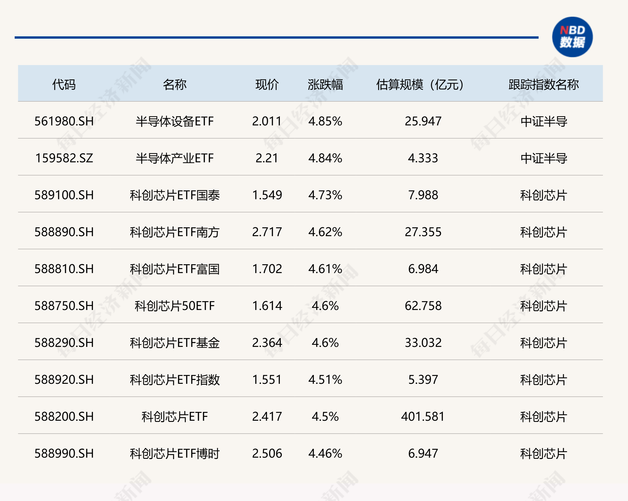 ETF漲跌幅方面,半導(dǎo)體、芯片相關(guān)ETF漲超4%。