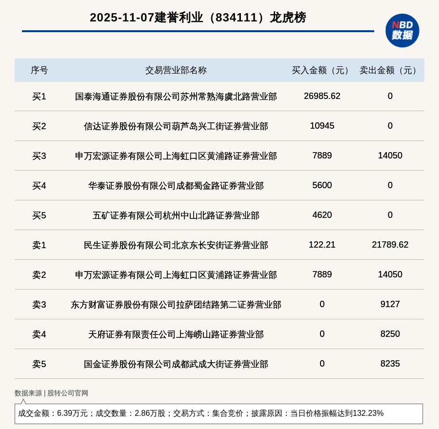每經(jīng)訊,2025年11月7日,新三板創(chuàng)新層公司建譽(yù)利業(yè)(834111,收盤價(jià):2.8元)登上龍虎榜,交易方式是集合競價(jià),披露原因是當(dāng)日價(jià)格振幅達(dá)到132.23%,成交數(shù)量2.86萬股,成交金額6.39萬元。買一席位為國泰海通證券股份有限公司蘇州常熟海虞北路營業(yè)部,買入2.7萬元;賣一席位為民生證券股份有限公司北京東長安街證券營業(yè)部,賣出2.18萬元。