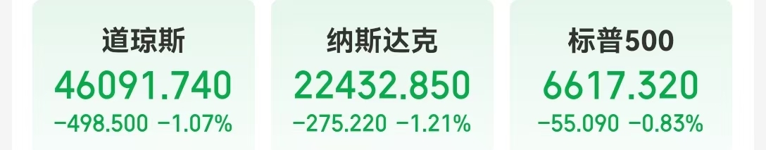 當(dāng)?shù)貢r(shí)間11月18日,美股三大指數(shù)集體收跌,道瓊斯指數(shù)下跌498.500點(diǎn),跌幅1.07%;標(biāo)普500指數(shù)跌0.83%;納斯達(dá)克綜合指數(shù)跌1.21%。