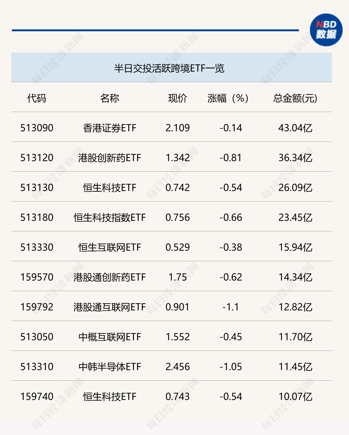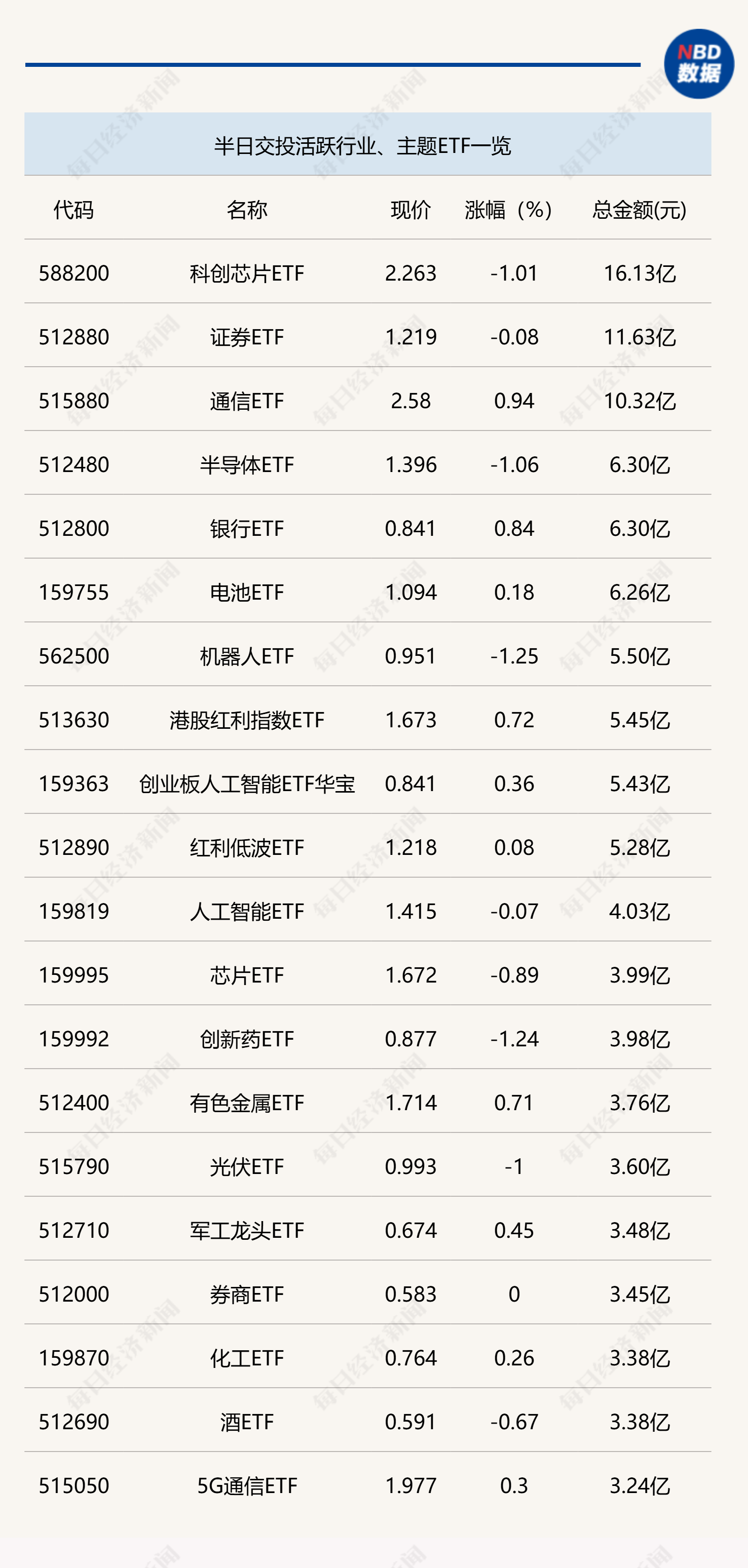 今日上午,ETF交易整體相對平淡,科創(chuàng)芯片ETF(588200)、證券ETF(512880)以及通信ETF(515880)半日成交金額超過10億元,而在跨境ETF方面,則無一只品種半日成交金額超50億元。