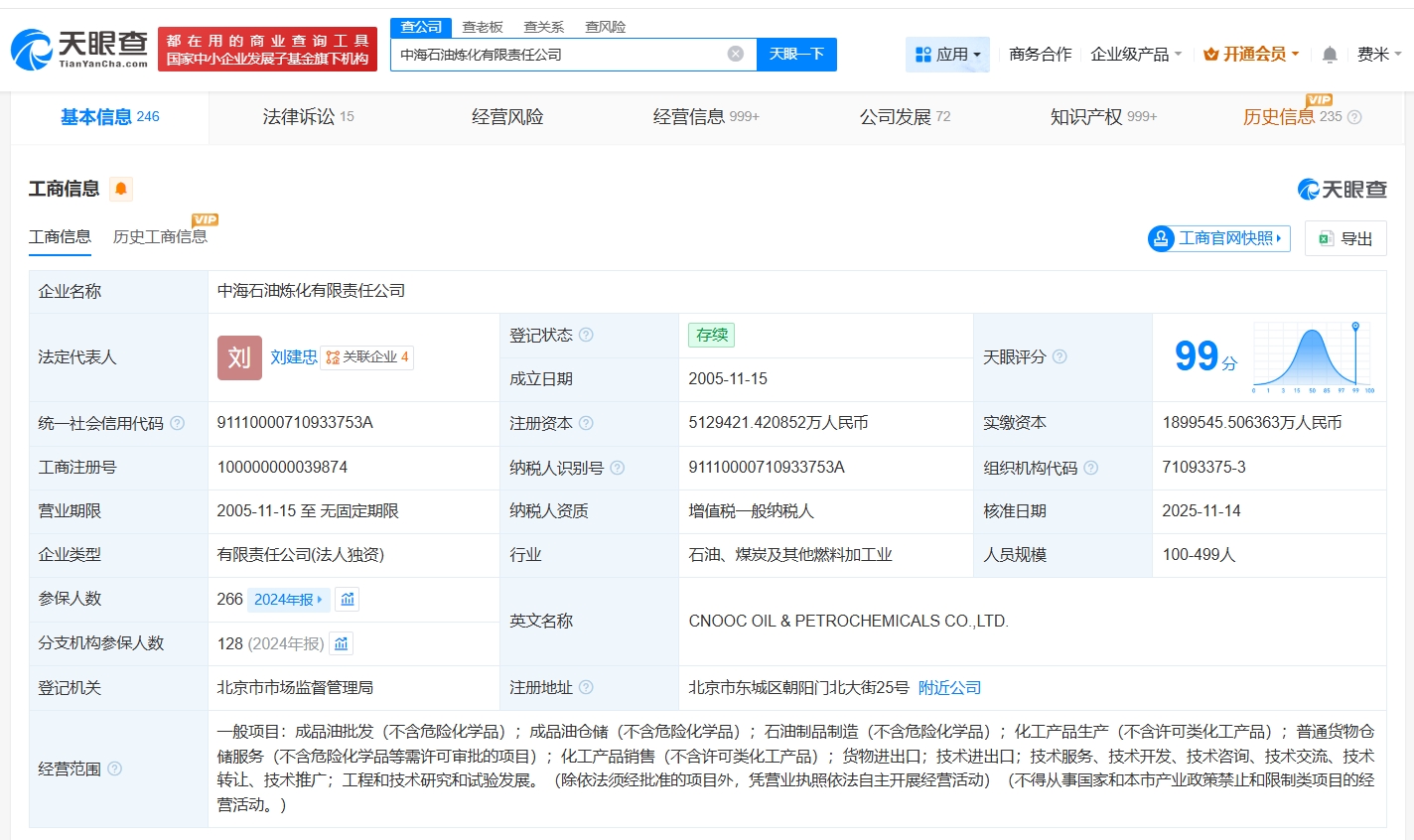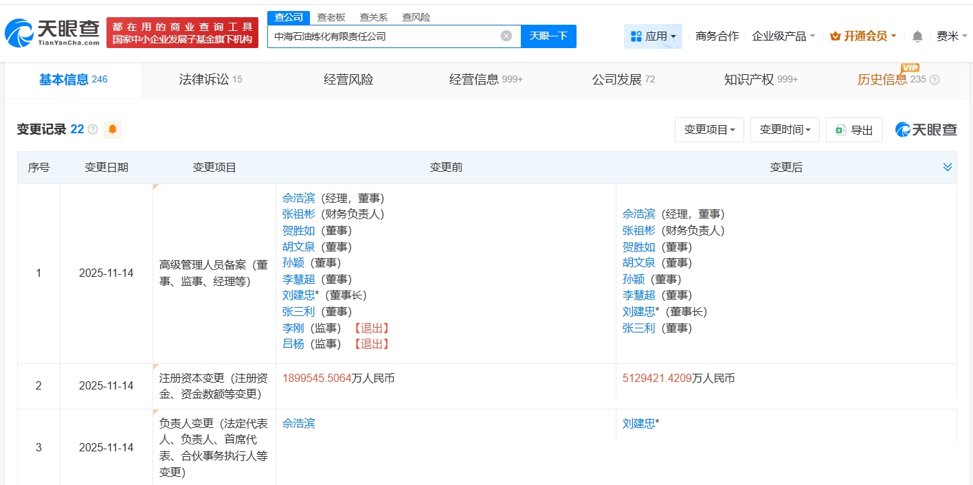 每經(jīng)AI快訊,天眼查工商信息顯示,近日,中海石油煉化有限責(zé)任公司發(fā)生工商變更,注冊資本由約189.95億元人民幣增至約512.94億元人民幣,增幅約170%,佘浩濱卸任該公司法定代表人,由劉建忠接任,同時部分主要人員發(fā)生變更。中海石油煉化有限責(zé)任公司成立于2005年11月,經(jīng)營范圍含成品油批發(fā)、成品油倉儲、石油制品制造、化工產(chǎn)品生產(chǎn)等。股東信息顯示,該公司由中國海洋石油集團(tuán)有限公司全資持股。