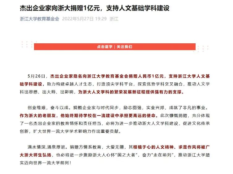 2022年匿名捐贈(zèng)浙江大學(xué)1億元。截圖自公眾號(hào)