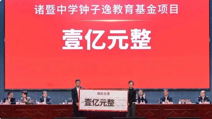 據(jù)錢江晚報(bào)11月23日消息,11月22日上午,諸暨市教育大會(huì)上,諸暨市教育強(qiáng)市獎(jiǎng)勵(lì)基金成立,現(xiàn)場收到多家企業(yè)累計(jì)1.42億元捐贈(zèng)。其中,農(nóng)夫山泉?jiǎng)?chuàng)始人鐘睒睒以個(gè)人名義向諸暨中學(xué)捐贈(zèng)一億元人民幣,成立諸暨中學(xué)鐘子逸教育基金項(xiàng)目。