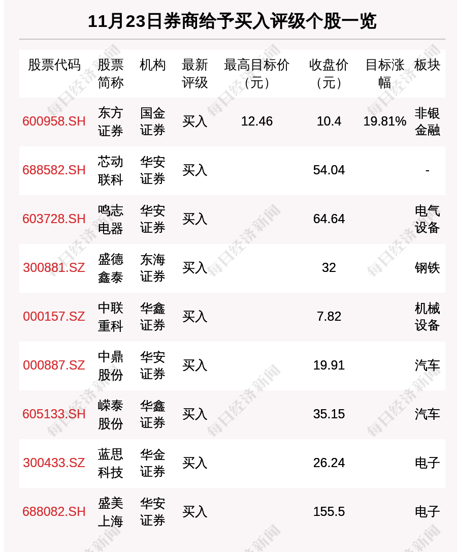 每經(jīng)AI快訊,11月23日,券商給予評(píng)級(jí)的個(gè)股數(shù)共有15只,獲得買入評(píng)級(jí)的個(gè)股數(shù)共有9只。在公布了目標(biāo)價(jià)格的1只個(gè)股中,按照最新收盤價(jià)計(jì)算,預(yù)期漲幅排名居前的個(gè)股是東方證券(600958.SH),預(yù)期漲幅是19.81%。