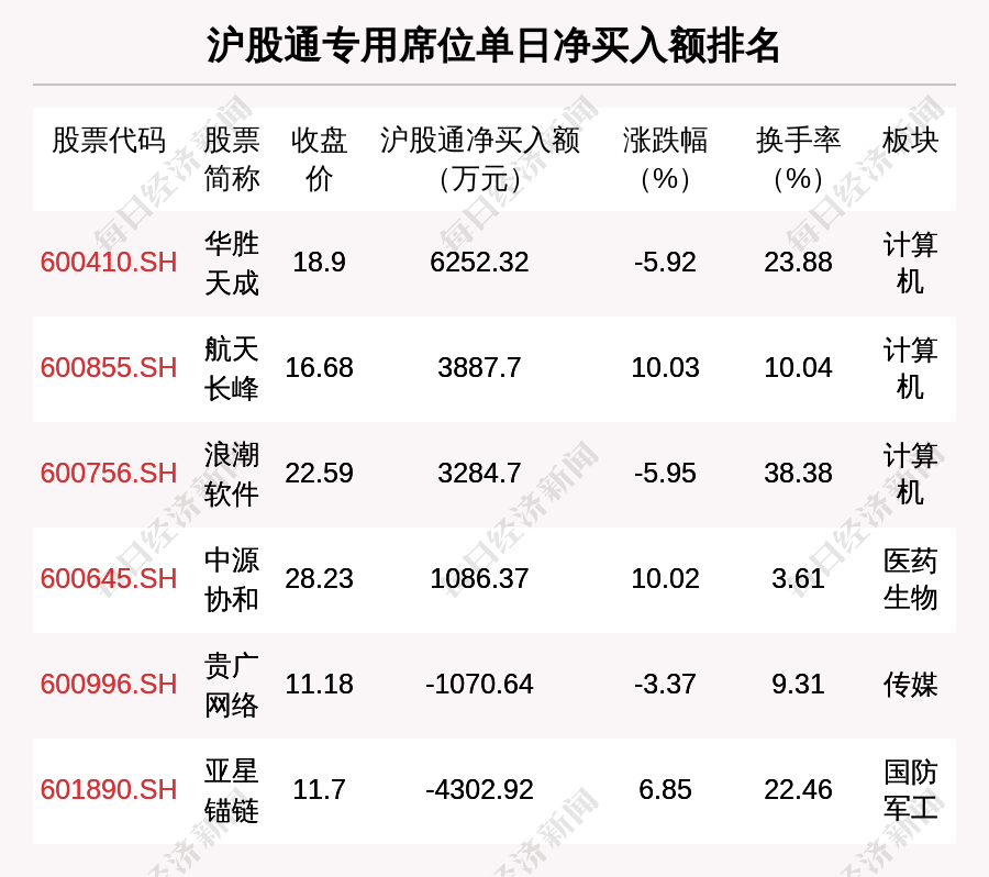 在龍虎榜中,涉及滬股通專用席位的個(gè)股有6只,華勝天成的滬股通專用席位凈買入額最大,凈買入6252.32萬元。