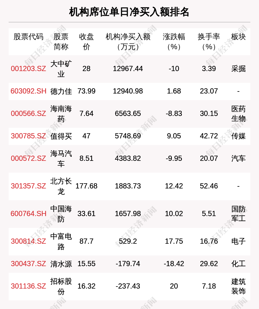 在龍虎榜中,涉及機(jī)構(gòu)專用席位的個(gè)股有21只,凈買入額前三的是大中礦業(yè)、德力佳、海南海藥,分別為1.3億元、1.29億元、6563.65萬元。