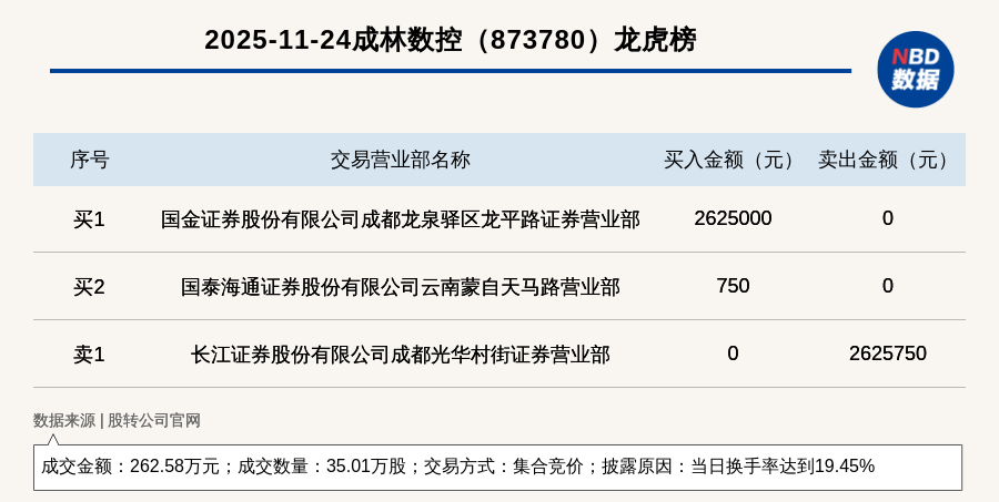 每經(jīng)訊,2025年11月24日,新三板創(chuàng)新層公司成林數(shù)控(873780,收盤價:7.5元)登上龍虎榜,交易方式是集合競價,披露原因是當日換手率達到19.45%,成交數(shù)量35.01萬股,成交金額262.58萬元。買一席位為國金證券股份有限公司成都龍泉驛區(qū)龍平路證券營業(yè)部,買入262.5萬元;賣一席位為長江證券股份有限公司成都光華村街證券營業(yè)部,賣出262.58萬元。
