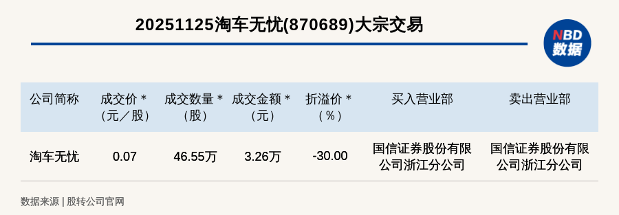 每經(jīng)訊,2025年11月25日,新三板基礎(chǔ)層公司淘車無憂(870689,收盤價(jià):0.1元)發(fā)生一筆大宗交易,成交價(jià)0.07元/股,成交數(shù)量46.55萬股,成交金額3.26萬元,折價(jià)30%。買入營業(yè)部是國信證券股份有限公司浙江分公司,賣出營業(yè)部是國信證券股份有限公司浙江分公司。