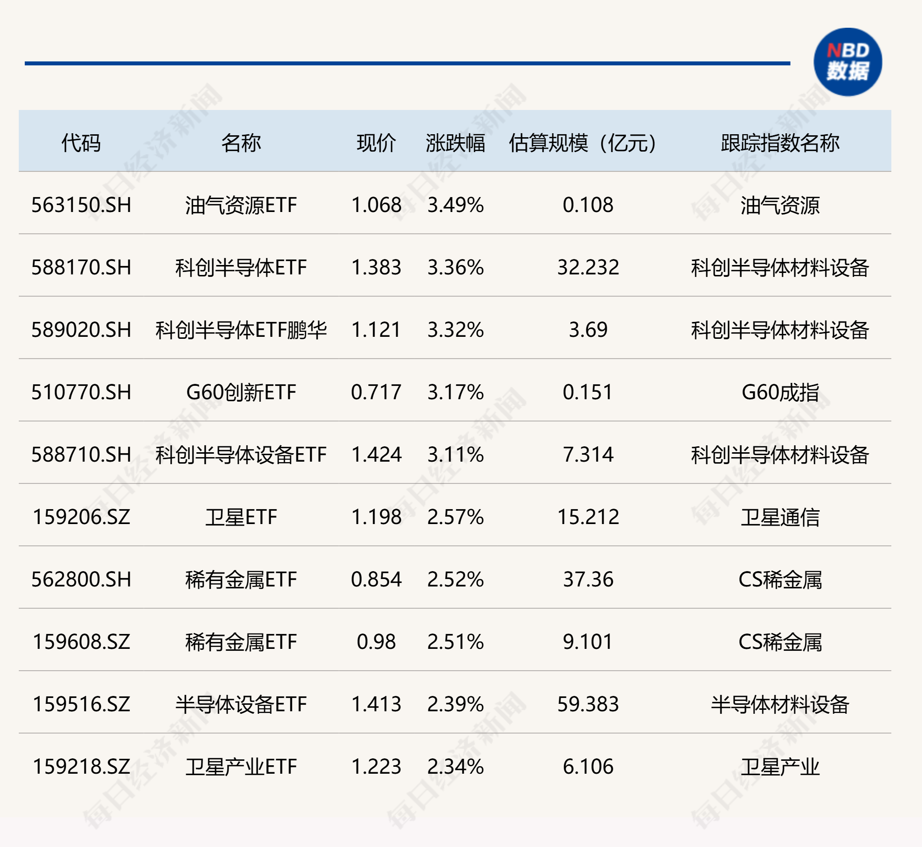 ETF漲跌幅方面,油氣資源、科創(chuàng)半導(dǎo)體相關(guān)ETF漲超3%。