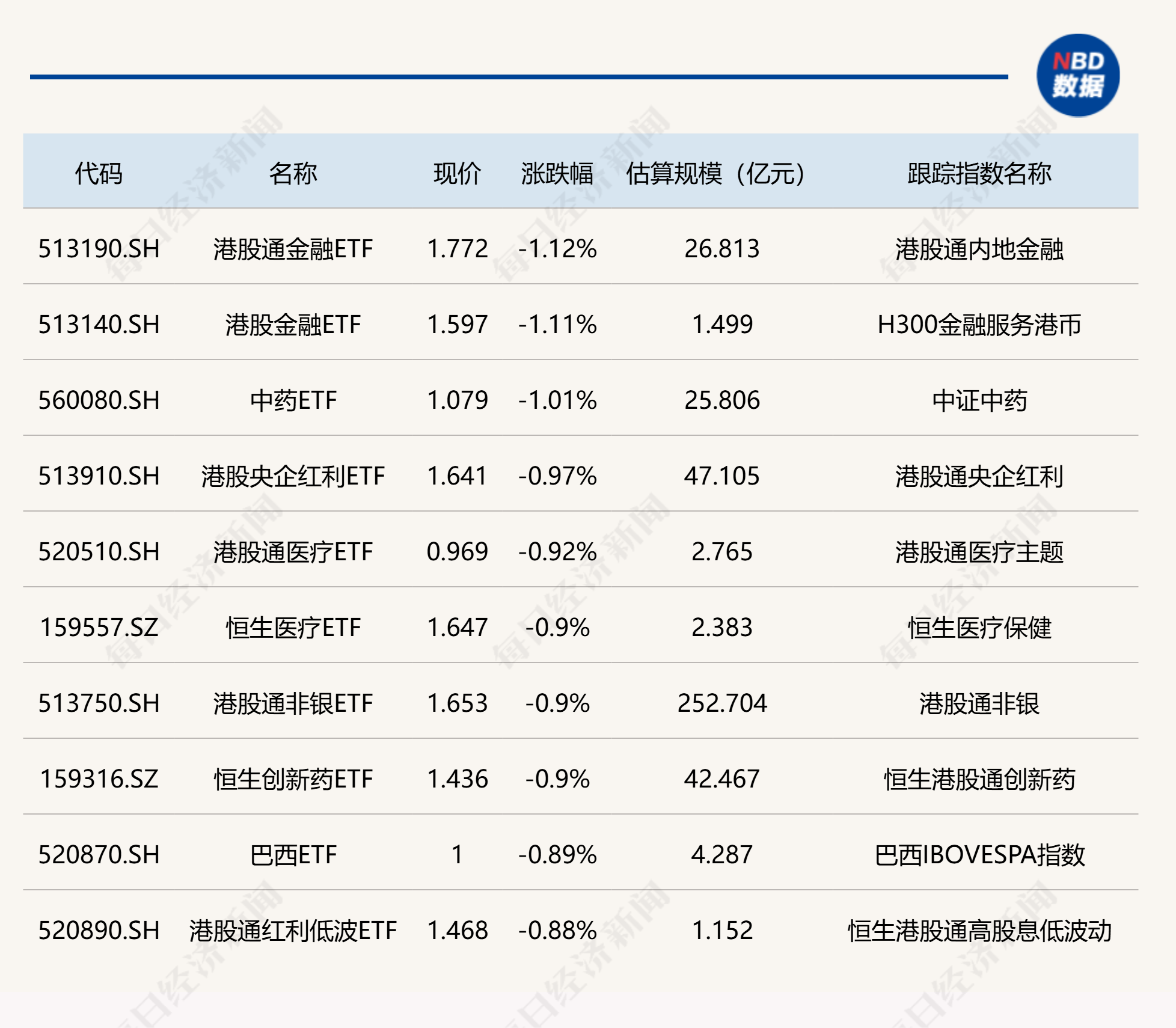下跌方面,港股通金融、中藥等ETF跌超1%。