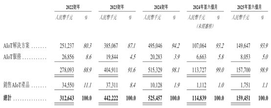 2022年至2024年各年度及2025年上半年(下簡稱報告期)內(nèi),德風新征程主要業(yè)務為AIoT解決方案(向客戶提供跨行業(yè)及行業(yè)特定的AIoT解決方案)、提供AIoT服務(向客戶提供維護及技術(shù)支持服務)和銷售AIoT產(chǎn)品。其中,AIoT解決方案在總收入中占比最高,報告期內(nèi)均在80%以上。