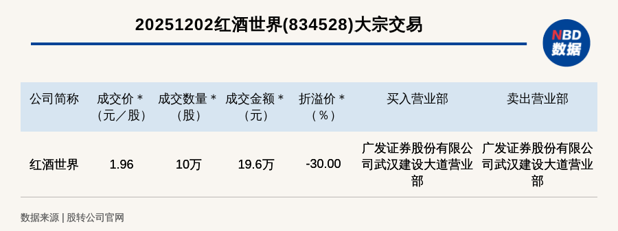 每經(jīng)訊,2025年12月2日,新三板創(chuàng)新層公司紅酒世界(834528,收盤價:2.8元)發(fā)生一筆大宗交易,成交價1.96元/股,成交數(shù)量10萬股,成交金額19.6萬元,折價30%。買入營業(yè)部是廣發(fā)證券股份有限公司武漢建設(shè)大道營業(yè)部,賣出營業(yè)部是廣發(fā)證券股份有限公司武漢建設(shè)大道營業(yè)部。