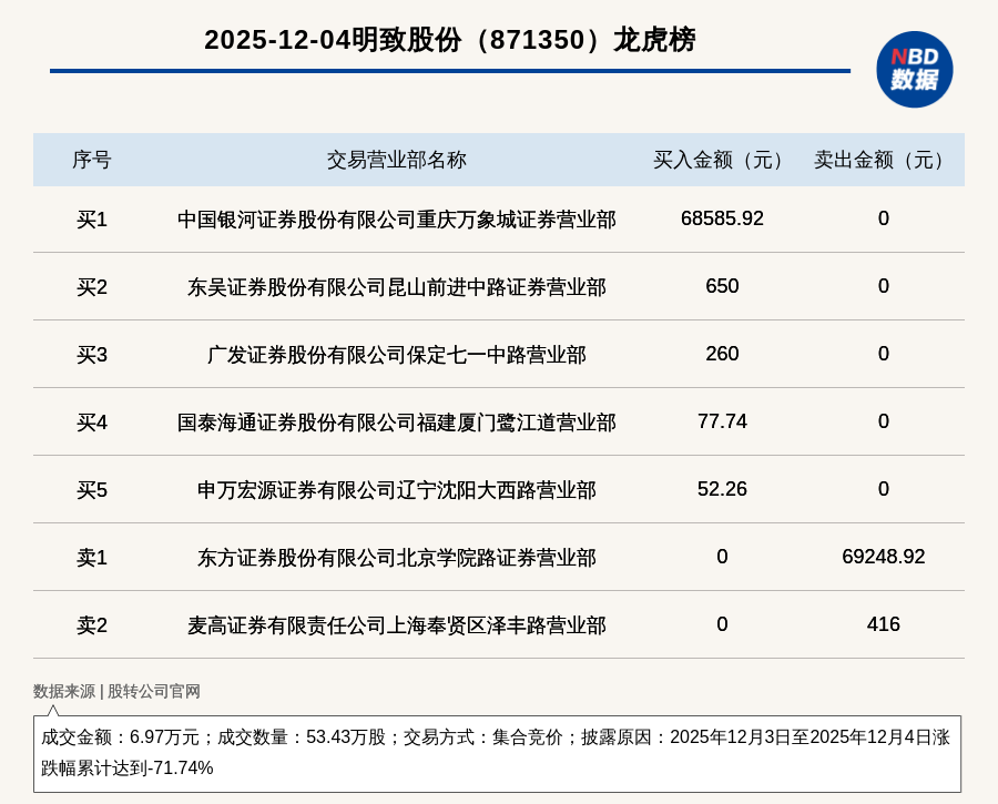 每經(jīng)訊,2025年12月4日,新三板基礎(chǔ)層公司明致股份(871350,收盤價(jià):0.13元)登上龍虎榜,交易方式是集合競(jìng)價(jià),披露原因是2025年12月3日至2025年12月4日漲跌幅累計(jì)達(dá)到-71.74%,成交數(shù)量53.43萬(wàn)股,成交金額6.97萬(wàn)元。買一席位為中國(guó)銀河證券股份有限公司重慶萬(wàn)象城證券營(yíng)業(yè)部,買入6.86萬(wàn)元;賣一席位為東方證券股份有限公司北京學(xué)院路證券營(yíng)業(yè)部,賣出6.92萬(wàn)元。