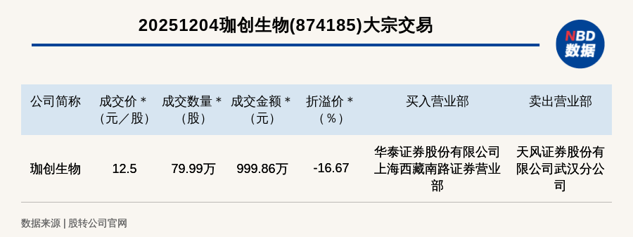 每經(jīng)訊,2025年12月4日,新三板創(chuàng)新層公司珈創(chuàng)生物(874185,收盤價(jià):15元)發(fā)生一筆大宗交易,成交價(jià)12.5元/股,成交數(shù)量79.99萬股,成交金額999.86萬元,折價(jià)16.67%。買入營(yíng)業(yè)部是華泰證券股份有限公司上海西藏南路證券營(yíng)業(yè)部,賣出營(yíng)業(yè)部是天風(fēng)證券股份有限公司武漢分公司。