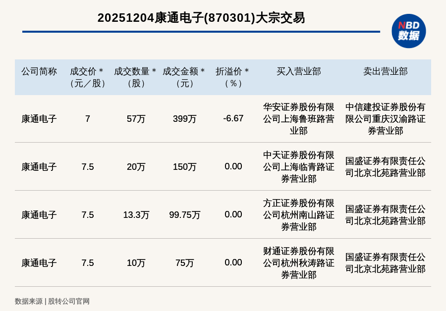 每經(jīng)訊,2025年12月4日,新三板創(chuàng)新層公司康通電子(870301,收盤價(jià):7.5元)發(fā)生4筆大宗交易,總成交金額為723.75萬元,成交金額最高的一筆成交價(jià)7元/股,成交數(shù)量57萬股,成交金額399萬元,折價(jià)6.67%。買入營業(yè)部是華安證券股份有限公司上海魯班路營業(yè)部,賣出營業(yè)部是中信建投證券股份有限公司重慶漢渝路證券營業(yè)部。