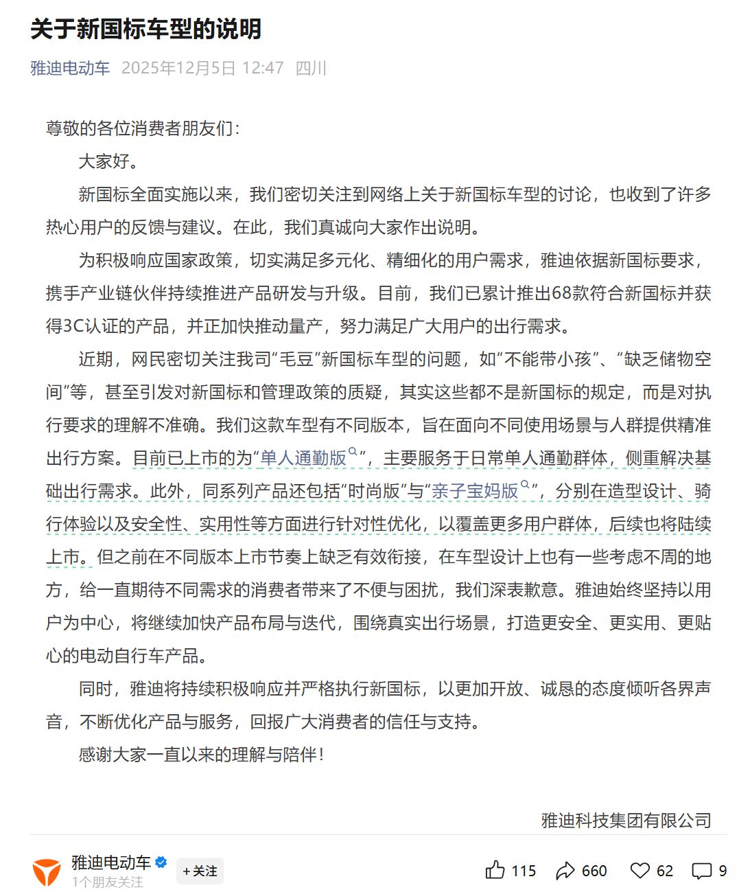 12月5日,雅迪電動車發(fā)文稱,新國標(biāo)全面實施以來,我們密切關(guān)注到網(wǎng)絡(luò)上關(guān)于新國標(biāo)車型的討論,也收到了許多熱心用戶的反饋與建議。在此,我們真誠向大家作出說明。