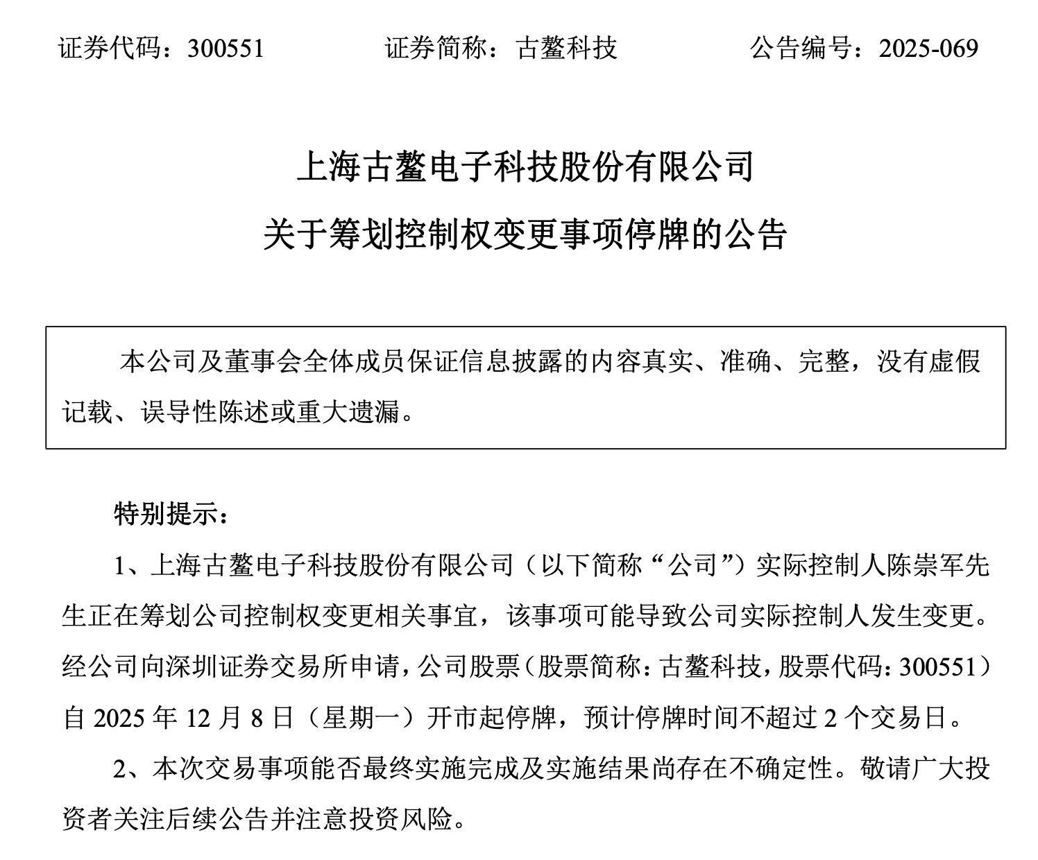 12月7日,古鰲科技(300551.SZ)公告稱,公司實際控制人陳崇軍正在籌劃公司控制權(quán)變更相關(guān)事宜,該事項可能導(dǎo)致公司實際控制人發(fā)生變更。目前,各方主體正在就具體交易方案、協(xié)議等相關(guān)事項進(jìn)行論證和磋商,具體情況以各方簽訂的相關(guān)協(xié)議為準(zhǔn)。經(jīng)公司向深圳證券交易所申請,公司股票自2025年12月8日開市起停牌,預(yù)計停牌時間不超過2個交易日。