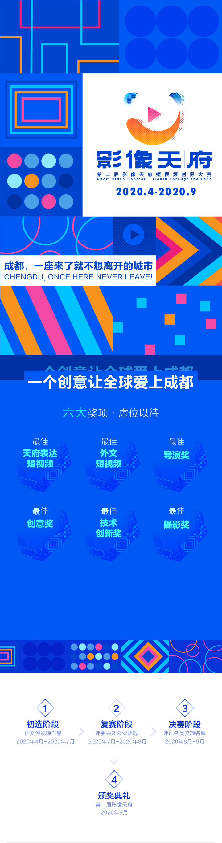 “第二屆影像天府·短視頻創(chuàng)攝大賽”于2020年4月正式啟動(dòng),邀約全球創(chuàng)攝愛(ài)好者續(xù)寫(xiě)“成都,一座來(lái)了就不想離開(kāi)的城市”篇章,征集優(yōu)質(zhì)影像作品。本次大賽設(shè)置最佳天府表達(dá)短視頻、最佳外文短視頻、最佳導(dǎo)演獎(jiǎng)、最佳創(chuàng)意獎(jiǎng)、最佳技術(shù)創(chuàng)新獎(jiǎng)、最佳攝影獎(jiǎng)六大專(zhuān)業(yè)。評(píng)委包括中國(guó)電影家協(xié)會(huì)副主席,上海電影家協(xié)會(huì)主席任仲倫;艾美獎(jiǎng)得主,美國(guó)著名影視導(dǎo)演、制片人Mark