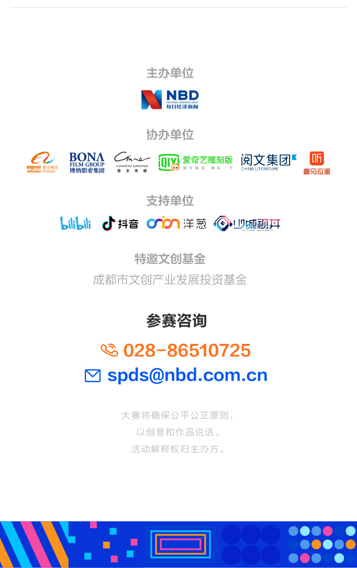 “第二屆影像天府·短視頻創(chuàng)攝大賽”于2020年4月正式啟動(dòng),邀約全球創(chuàng)攝愛(ài)好者續(xù)寫(xiě)“成都,一座來(lái)了就不想離開(kāi)的城市”篇章,征集優(yōu)質(zhì)影像作品。本次大賽設(shè)置最佳天府表達(dá)短視頻、最佳外文短視頻、最佳導(dǎo)演獎(jiǎng)、最佳創(chuàng)意獎(jiǎng)、最佳技術(shù)創(chuàng)新獎(jiǎng)、最佳攝影獎(jiǎng)六大專業(yè)。評(píng)委包括中國(guó)電影家協(xié)會(huì)副主席,上海電影家協(xié)會(huì)主席任仲倫;艾美獎(jiǎng)得主,美國(guó)著名影視導(dǎo)演、制片人Mark Zaslove;著名導(dǎo)演、編劇、制片人蔣欽民;洋蔥視頻聯(lián)合創(chuàng)始人聶陽(yáng)德......