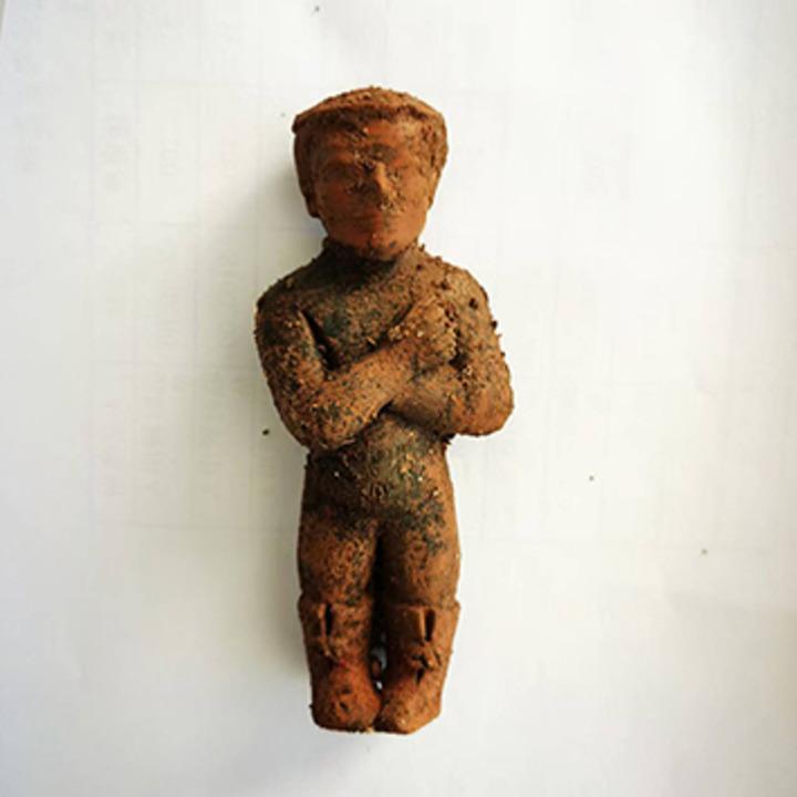 其中,一座長2.2米、寬1.5米的墓葬出土了兩件男、女陶塑站姿人俑,男俑戴帽穿靴,兩人均把雙手?jǐn)[在胸前,面部刻畫細(xì)膩,造型生動。