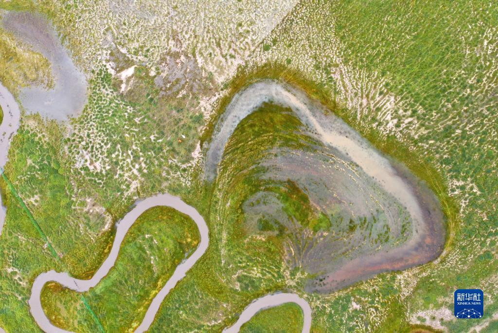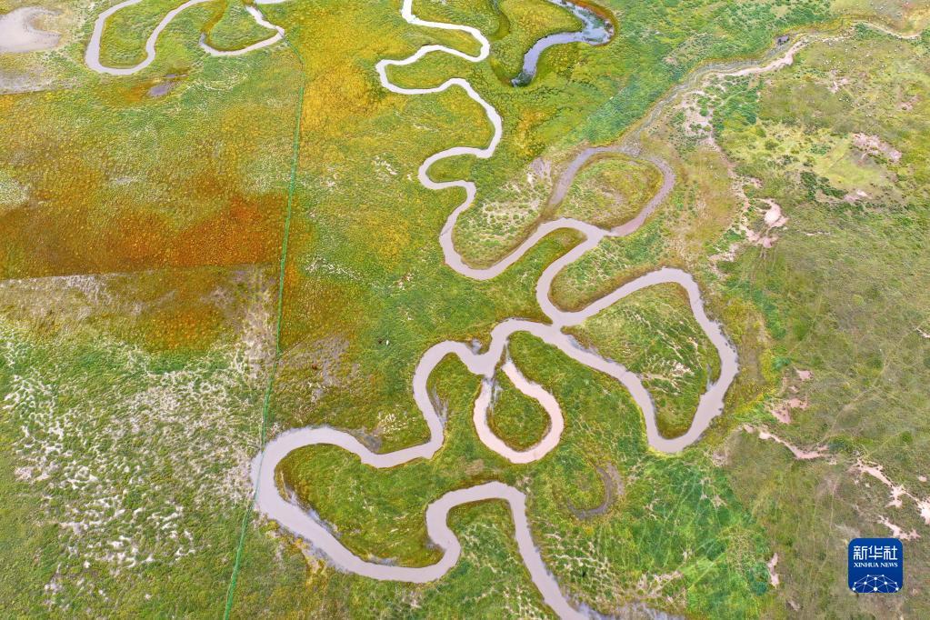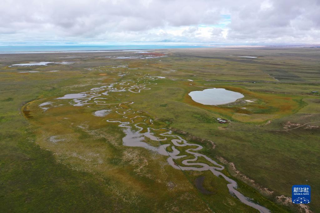 這是9月15日拍攝的青海湖畔的倒淌河(無人機(jī)照片)。?新華社記者 張龍 攝