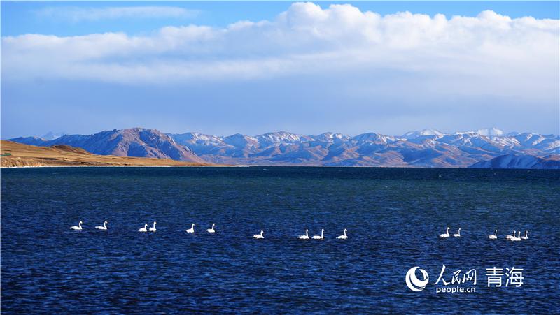 大天鵝在冬格措納湖“翩翩起舞”。人民網(wǎng)記者 楊啟紅攝