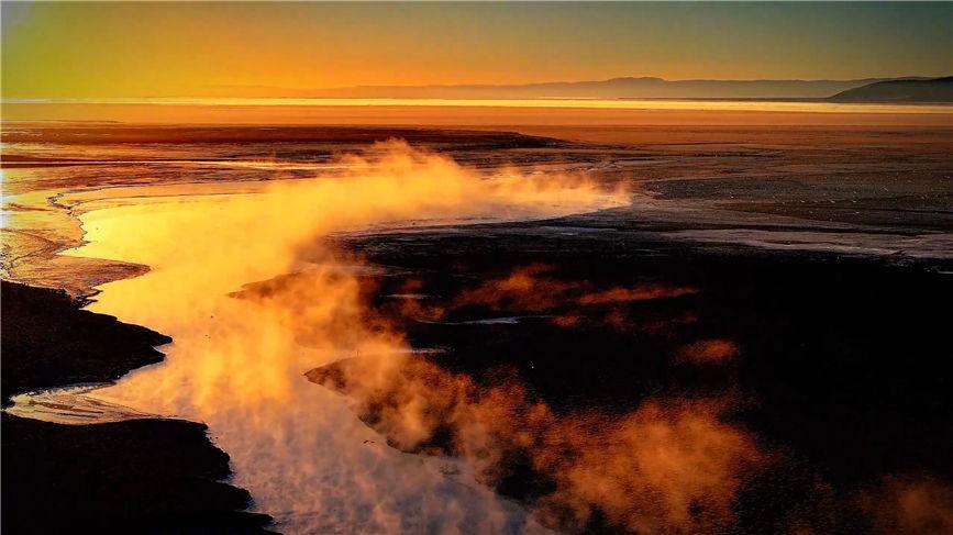 在青海湖泉灣濕地有一條冬天不結凍的小河,夜間空氣寒冷,溫暖的河水就蒸騰出霧氣,在霞光的照耀下頗為壯觀,當太陽升高,氣溫變暖霧氣就會逐步消失。越冬的天鵝也生活于此。