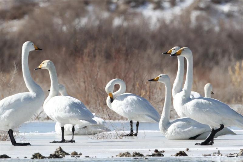 寒冬時節(jié),位于柴達木盆地的青海省海西蒙古族藏族自治州可魯克湖-托素湖省級自然保護區(qū)熱鬧了起來,上百只天鵝飛抵這里越冬,與其他鳥類一起為冬季的柴達木盆地增添了一份美麗與靈動。(張莉萍)