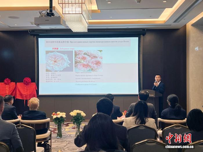 當?shù)貢r間12月18日,“云花”莫斯科展示廳暨昆明國際貿(mào)易莫斯科服務站舉行揭牌儀式。圖為中方代表介紹云南省鮮切花新品種?!√锉?攝