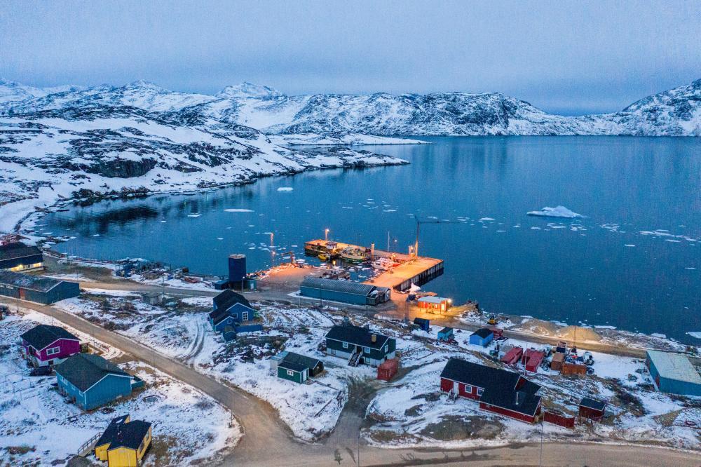 這是3月21日拍攝的丹麥自治領(lǐng)地格陵蘭島納爾薩克鎮(zhèn)的碼頭(無人機照片)。新華社記者彭子洋攝