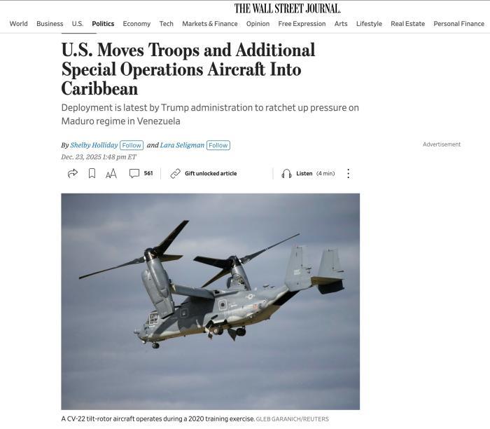 中新網(wǎng)12月24日電 據(jù)美國《華爾街日報》報道,本周美國已向加勒比地區(qū)調(diào)遣了大批特種作戰(zhàn)飛機、美軍人員及裝備,為華盛頓在委內(nèi)瑞拉采取軍事行動提供了更多選擇。
