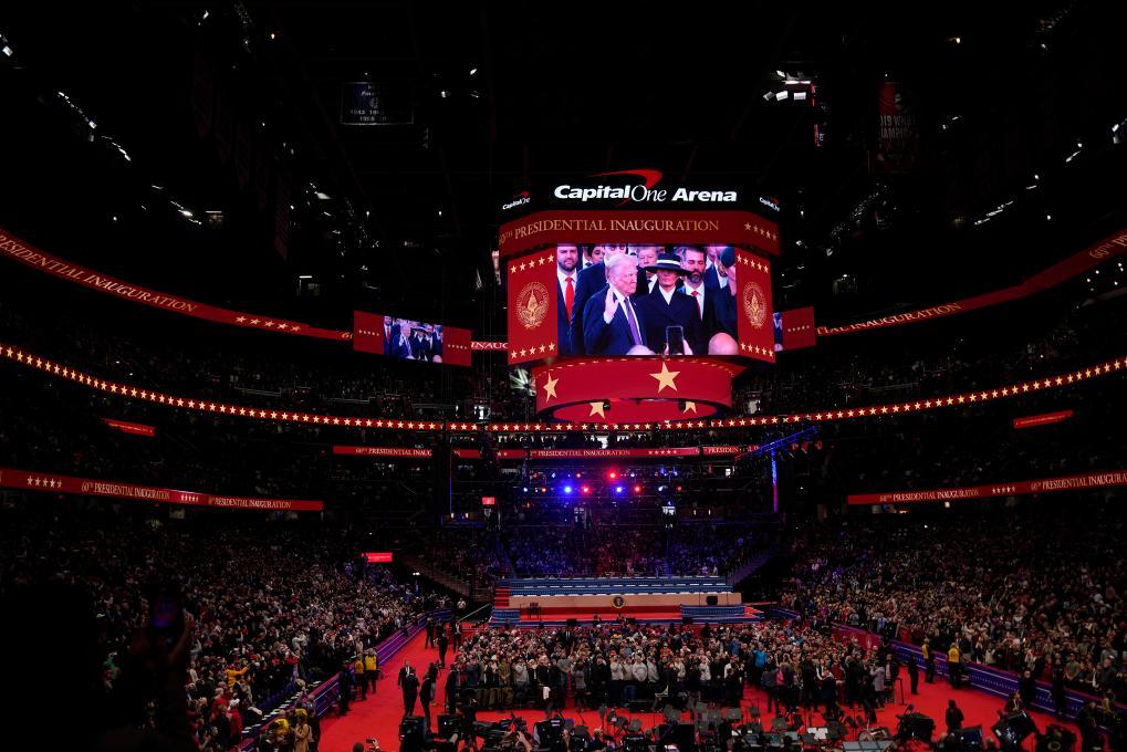 1月20日,在美國首都華盛頓第一資本體育館,人們觀看美國第47任總統(tǒng)就職典禮的轉(zhuǎn)播。新華社記者吳曉凌攝