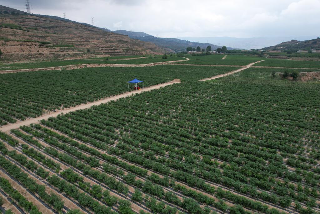 這是在天水市甘谷縣新興鎮(zhèn)侯家溝村拍攝的辣椒生產(chǎn)基地(無人機(jī)照片)。新華社記者 范培珅 攝