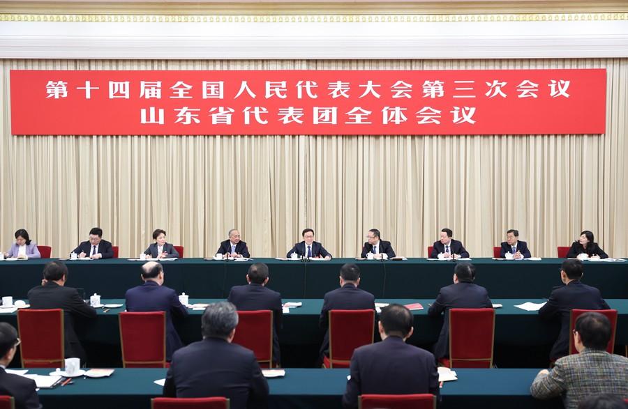 3月5日下午,國家副主席韓正來到他所在的山東代表團,同代表們一起審議政府工作報告。新華社記者 丁林 攝
