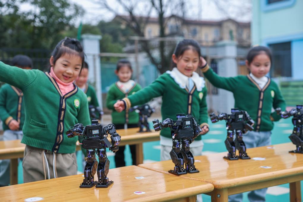 2025年2月19日,浙江諸暨市暨南街道南悅幼兒園的孩子們?cè)谕卣拐n程上觀看機(jī)器人舞蹈。新華社記者 徐昱 攝