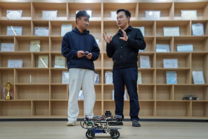 10月29日,鄭棋元(右)在云南技師學(xué)院辦公室指導(dǎo)學(xué)生對移動機器人進行調(diào)試。新華社記者 彭奕凱 攝