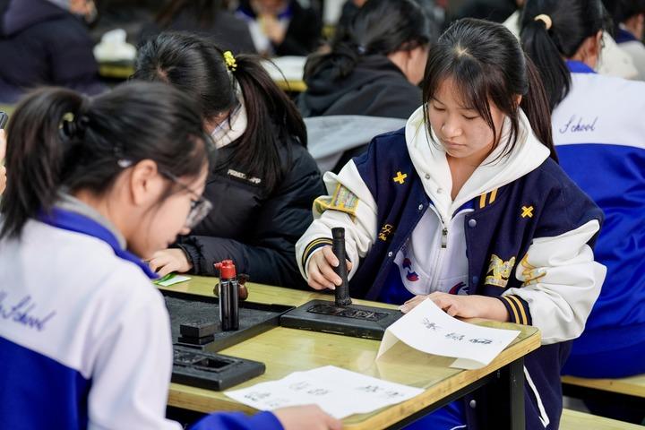 學生在西夏陵體驗木活字印刷西夏文。新華社記者楊植森 攝