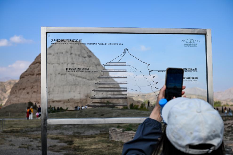 游客透過復原西夏陵陵塔輪廓的亞克力板拍照打卡。新華社記者馮開華 攝