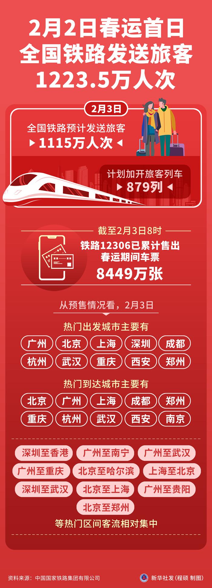 新華社北京2月3日電 從中國國家鐵路集團有限公司獲悉,2月3日,全國鐵路預計發(fā)送旅客1115萬人次,計劃加開旅客列車879列。2月2日,全國鐵路發(fā)送旅客1223.5萬人次,運輸安全平穩(wěn)有序。
