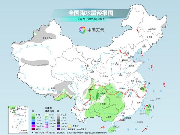 明天,此次雨雪過(guò)程將減弱、收尾,降水主要集中在西南地區(qū)東部到江南西部一帶。預(yù)計(jì)新疆沿天山地區(qū)和南疆盆地、西藏東南部、青海南部、川西高原、貴州北部等地部分地區(qū)有小雪或雨夾雪。西藏東南部、江南西部、西南地區(qū)東部和南部、華南大部、臺(tái)灣島等地部分地區(qū)有小雨,其中,四川盆地東南部等地部分地區(qū)有中雨。