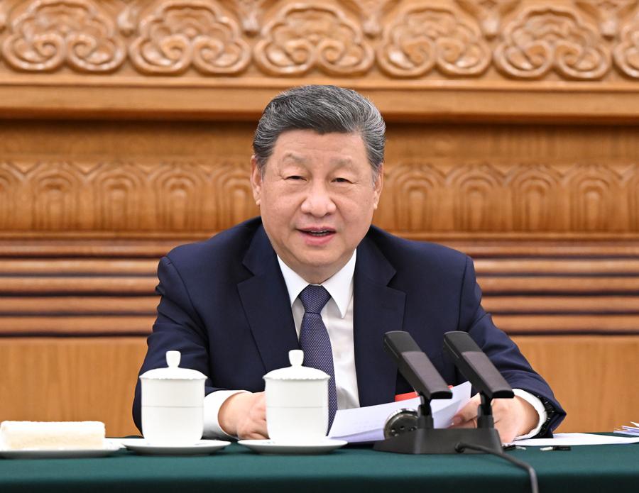 3月5日下午,中共中央總書記、國家主席、中央軍委主席習(xí)近平參加他所在的十四屆全國人大四次會(huì)議江蘇代表團(tuán)審議。新華社記者 殷博古 攝
